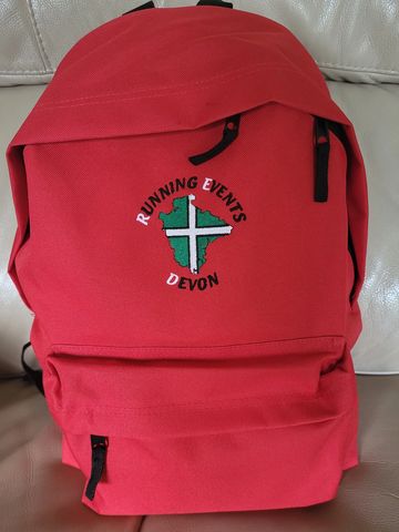 Lovely red backpack with embroidered logo on the front.